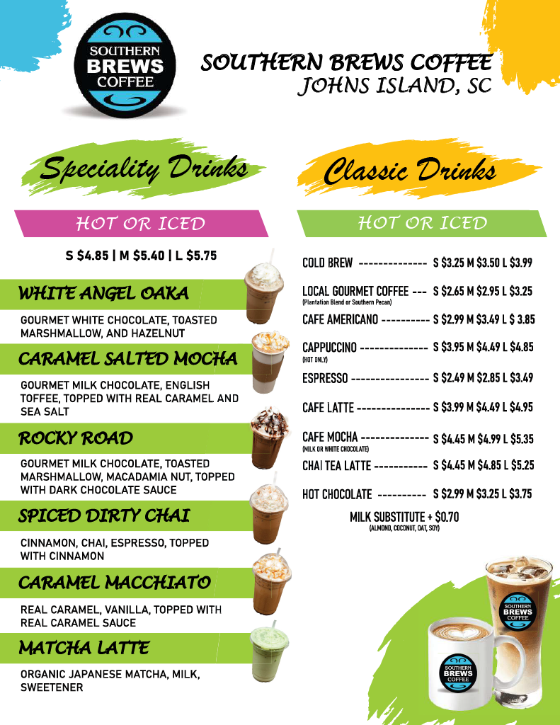 Introducing Southern Brews Coffee, where flavor meets experience on Johns Island! Located at 2812 Maybank Hwy, this charming coffee haven offers a menu designed to excite your palate. The highlight is the Caramel Salted Mocha, a delightful blend of gourmet chocolate, English toffee, and espresso, perfectly topped with caramel and sea salt. For cold brew enthusiasts, the Nitro Cold Brew promises a refreshing kick of nitrogen-infused goodness.